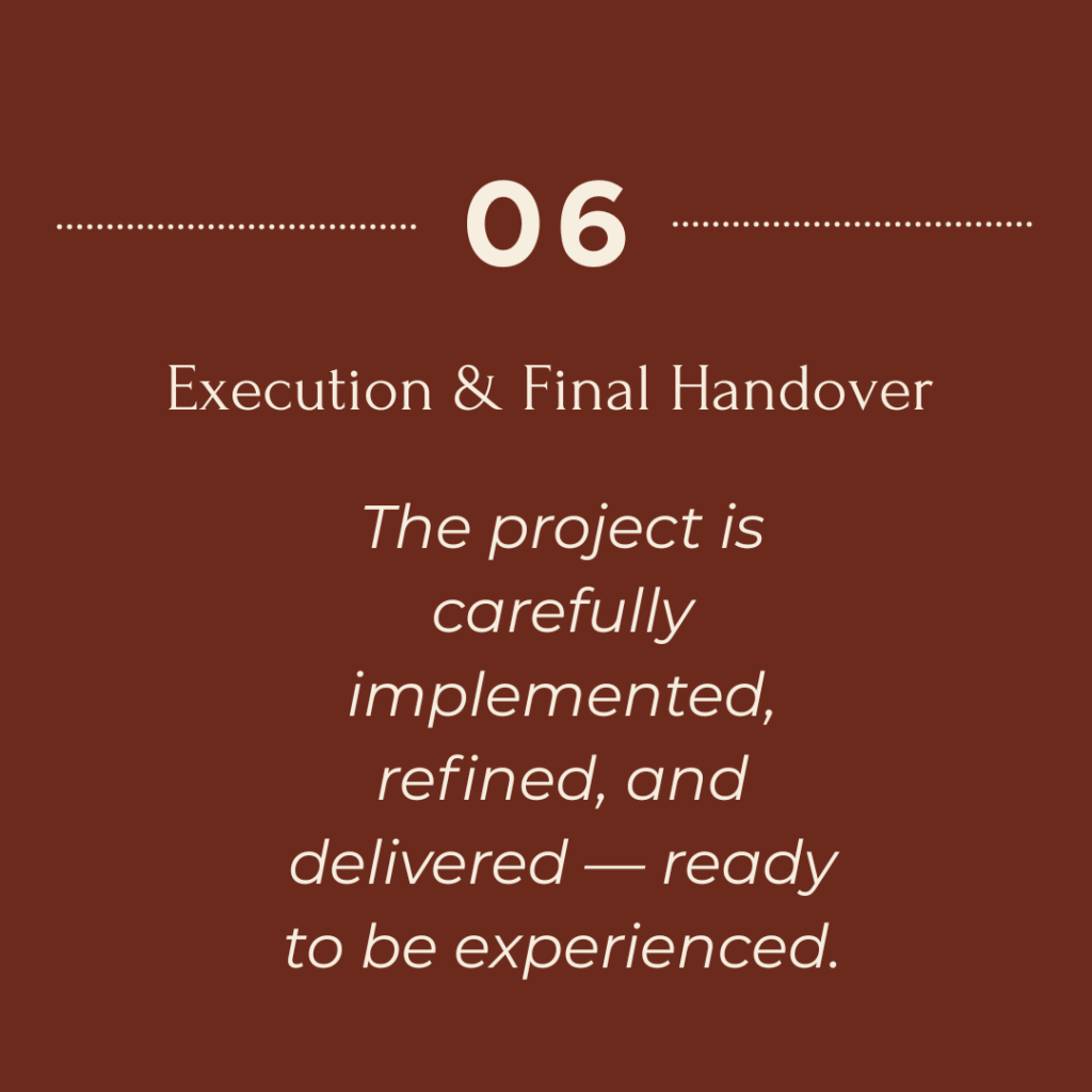 A thoughtfully structured design journey — guiding your project from the first conversation to final handover with clarity and precision.