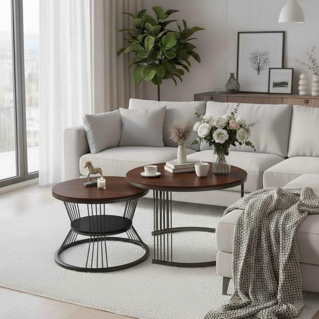 Round Coffee Table Set of 2 for Living Room Wooden Top with Black Metal Frame Modern Nesting Center Table for Sofa Area Home & Office Furniture